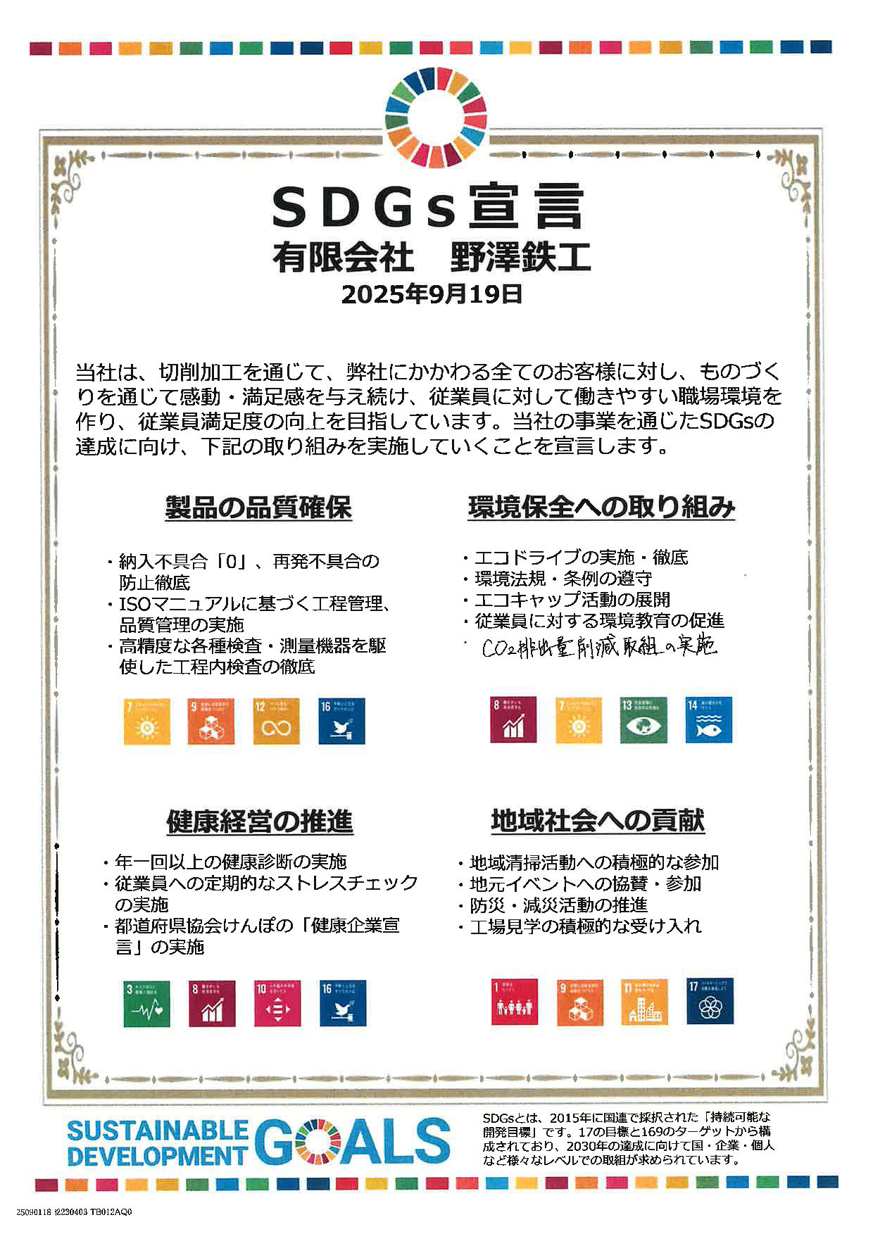この度、有限会社 野澤鉄工は、国際目標であるSDGsへの貢献を正式に宣言いたしました。 添付の宣言通り、SDGs達成に向けて全力を尽くし、社会に貢献してまいります。何卒よろしくお願い申し上げます。